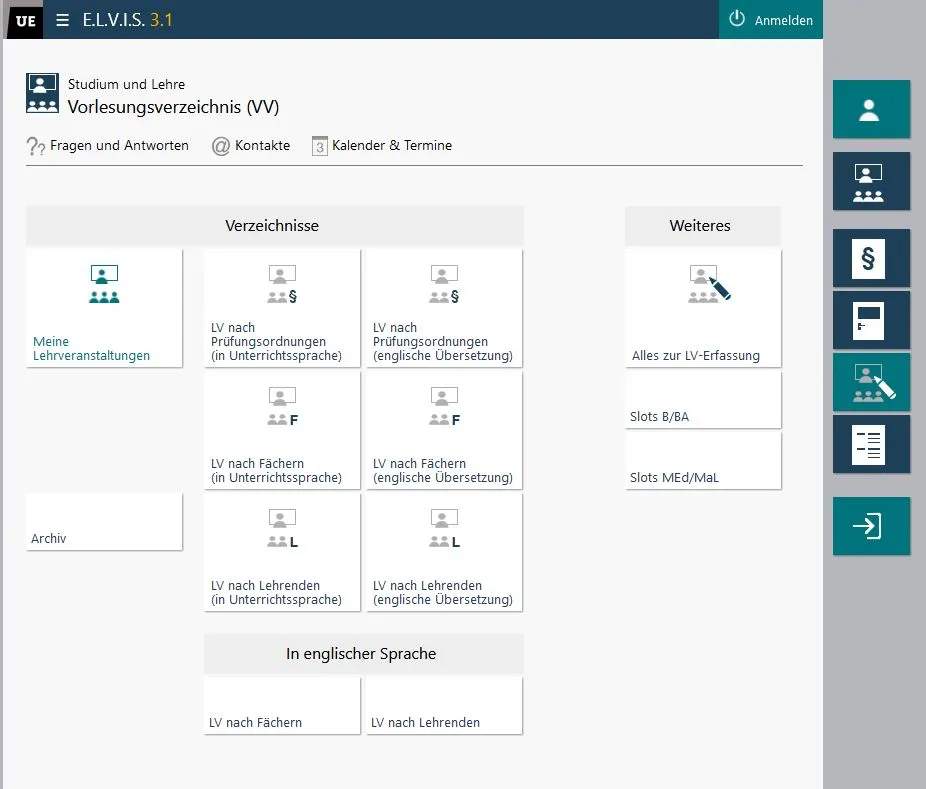 Ihre Lehrveranstaltungen für ein Semester finden Sie unter E.L.V.I.S.®: Meine Lehrveranstaltungen (Vorlesungsverzeichnis). Sortiert nach Studienfächern, Modulen und Teilmodulen erhalten Sie hier zu den Lehrveranstaltungen alle Informationen. Diese werden bis zum Beginn der Belegungsfrist auch aktualisiert.