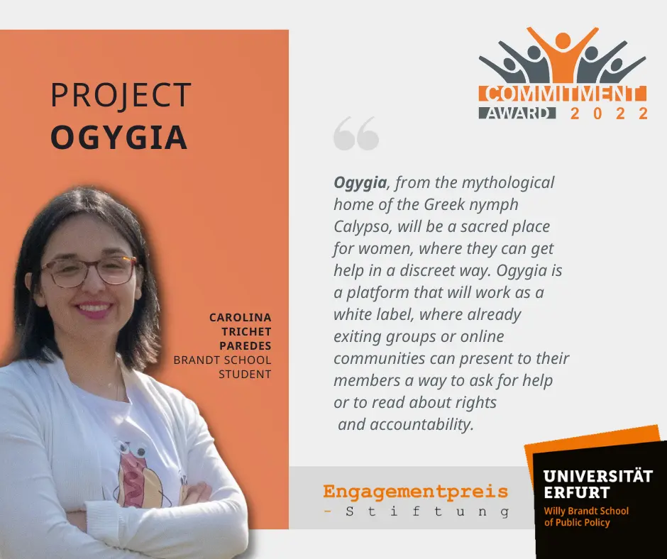 "Ogygia" ist nicht nur der Name einer Insel in der griechischen Mythologie, es ist auch der Name einer Online-Plattform, die Carolina Trichet Paredes für Migrantinnen bereitstellen möchte. Sie sagt, eine der größten Folgen der Pandemie sei geschlechtsspezifische Gewalt bei Migrantinnen. Damit und auch durch Sprachbarrieren gehe die Integration dieser Frauen in Deutschland langsamer voran. "Ogygia" soll das ändern und ein (virtueller) Ort sein, an dem Migrantinnen Hilfe bekommen. Mittels dieser Online-Plattform können sie sich über ihre Rechte informieren, Ansprechpartner für ihre Probleme finden und diese um Unterstützung bitten.