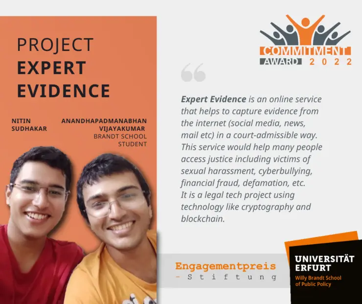 Dieser Online-Dienst hilft dabei, Beweise aus dem Internet (soziale Medien, Nachrichten, E-Mails usw.) in einer vor Gericht zulässigen Weise zu erfassen, denn Erfassungsmethoden wie Screenshots, Ausdrucke usw. sind in Gerichtsverfahren nicht als Beweismittel zulässig. Ein Dienst, der aber dabei hilft, dennoch Beweise zulässig zu erfassen, würde vielen Menschen helfen, Zugang zur Justiz zu erhalten, einschließlich Opfern von sexueller Belästigung, Cybermobbing, Finanzbetrug und Verleumdung. Dies gilt insbesondere dann, wenn es derzeit keine andere Möglichkeit gibt, solche Beweise zu sichern. Bei diesem innovativen und nachhaltigen Projekt handelt es sich um ein Legal-Tech-Projekt, das Technologien wie Kryptografie und Blockchain nutzt.