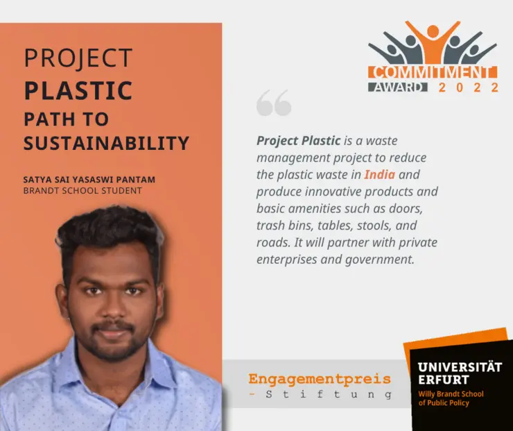 Bereits zum elften Mal verleiht die Willy Brandt School of Public Policy der Universität Erfurt in diesem Jahr zusammen mit der Engagementpreis-Stiftung den Commitment Award. Ziel ist es, nachhaltigen Ideen und sozialen Projekten eine Anschubfinanzierung zu ermöglichen. Studierende und Alumni der Brandt School können zugleich mit ihren Initiativen zeigen, was sie im Master-Studium gelernt haben. Die besten drei Projekte werden mit jeweils 1000 Euro Startkapital prämiert.