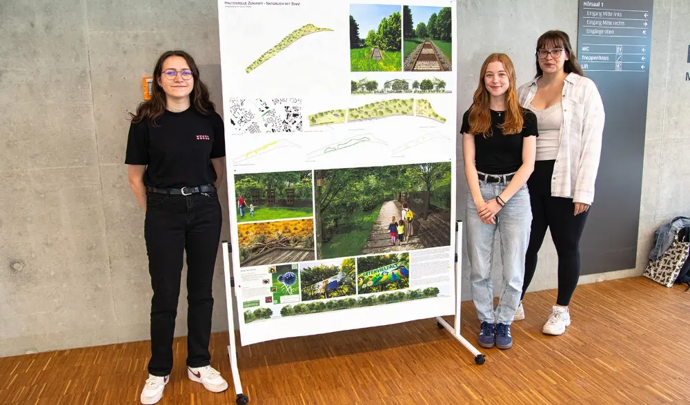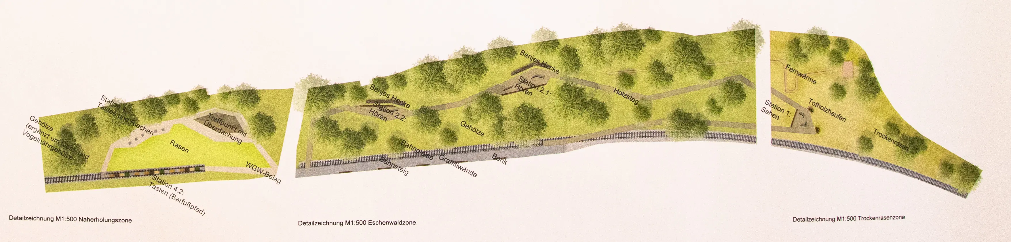 Dabei herausgekommen sind zwei Rundwege, die an vier verschiedenen Stationen entlangführen, die je unterschiedliche Sinne ansprechen. „In unserem Landschaftsplan haben wir versucht, das Ganze im Bereich der Straße noch mit Nährgehölzen für Vögel zu ergänzen, auch als besseren Schutz vor dem Straßenlärm“, erklärt Amely von der FH. Um den Bahnsteig für neue Zwecke aufzuwerten und für möglichst viele nutzbar zu machen, war ihnen eine barrierefreie Nutzung besonders wichtig. Rampen auf den Wegen ermöglichen Menschen mit Rollstuhl und Kinderwagen die Begehung trotz der Höhenunterschiede.