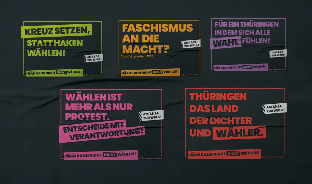 Und dann ging es für die Studierenden selbst frisch ans Werk: Zielgruppenanalyse, Marktanalyse, grafische Gestaltung, Strategieplanung. Inzwischen steht die fünfteilige Motivreihe. Große, fette Lettern rufen dazu auf, wählen zu gehen: „Kreuz setzen, statt Haken wählen“, heißt es auf einem Plakat. „Thüringen das Land der Dichter und Wähler“ auf einem anderen. Damit ihre Ideen beispielsweise auf Plakaten und in Radiospots die Wähler*innen in Thüringen vom Sofa an die Wahlurne bringen, suchen die Studierenden nun Sponsoren. „Es wäre toll, wenn wir mit deren Hilfe unser Projekt wirklich in die Tat umsetzen und damit auch einen kleinen Beitrag zur Stärkung der Demokratie in Thüringen leisten könnten“, sagt Fabian.