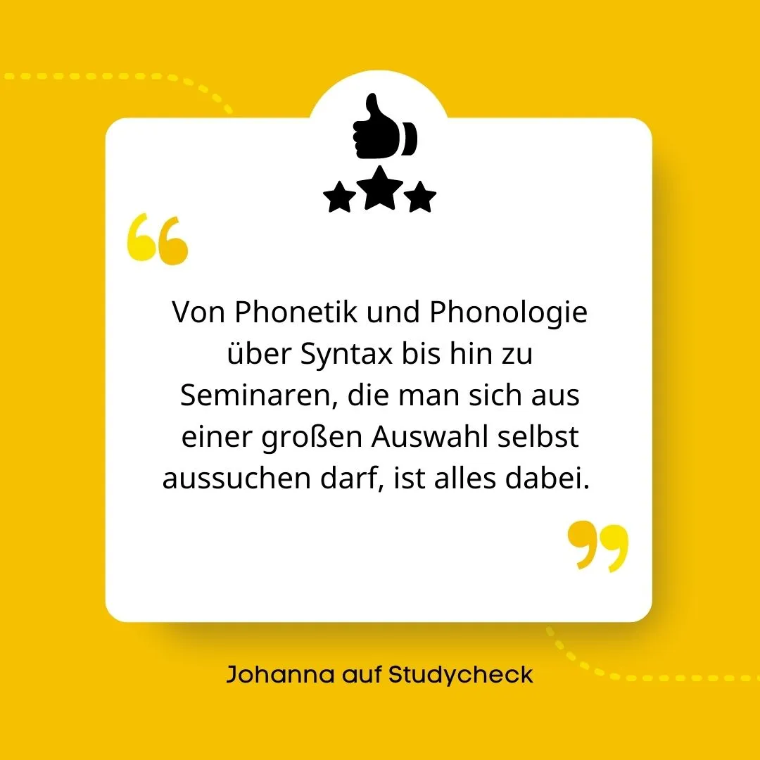 Ich studiere jetzt im dritten Semester Anglistik und mir macht es sehr Spaß. Tatsächlich finde ich die Literaturmodule gar nicht so spannend, dafür mag ich die Linguistikanteile des Studiums überraschend gerne! Die meisten Dozent*innen sind sehr freundlich und machen ihre Sache gut, ich hatte bisher schon einige sehr interessante Seminare (zum Beispiel Introduction to the USA, British Oral Practice oder Detective Fiction) – es ist also wirklich vielfältig und man lernt die Sprache und alles dahinter nochmal auf eine ganz neue Art und Weise kennen.