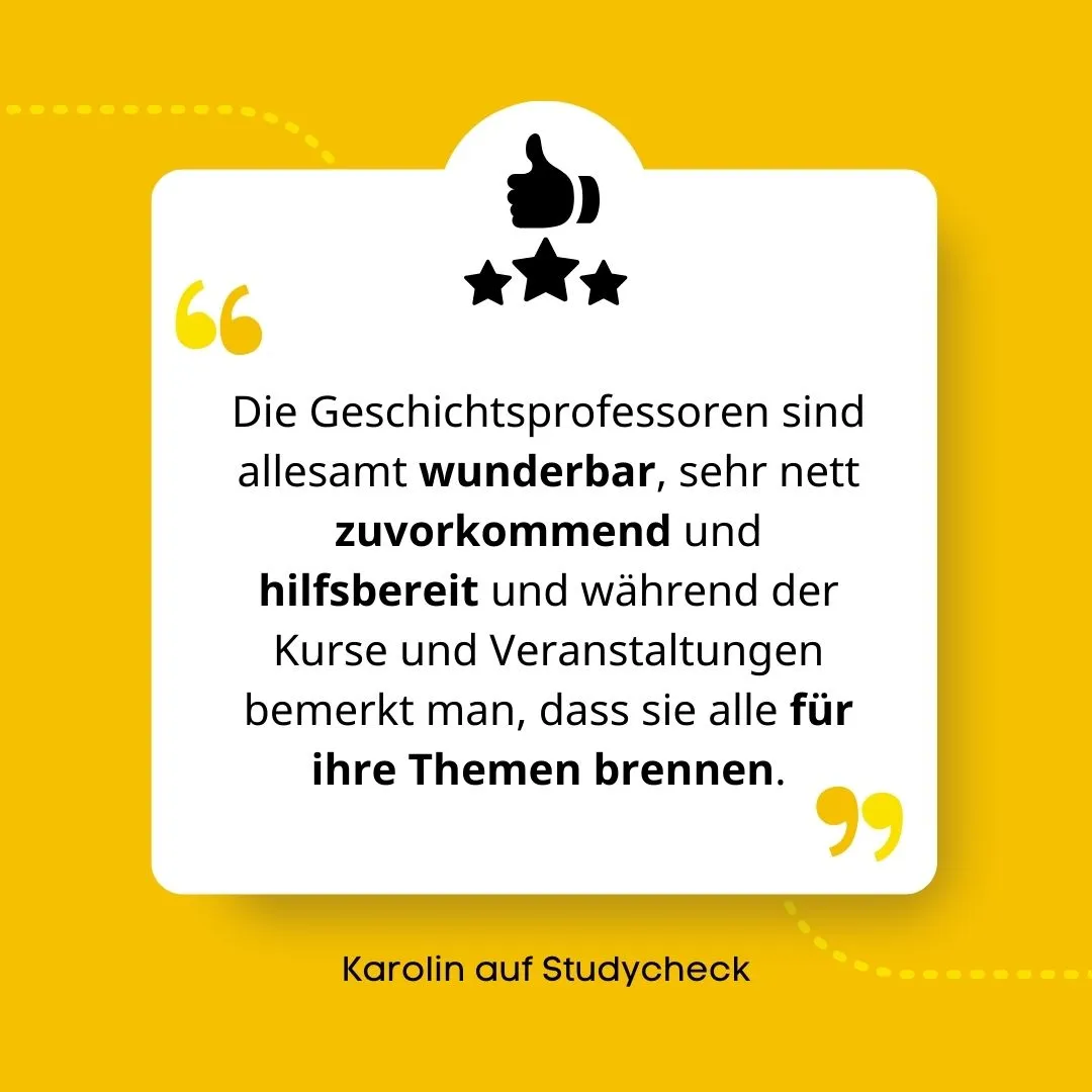Mehr anzeigenIn Geschichte gibt es für uns Studierende ein großes Angebot an Seminaren und Vorlesungen zu unterschiedlichen Epochen, Ereignissen und Perspektiven. Die Module zur Westasiatischen und Nordamerikanischen Geschichte haben mir besonders gut gefallen wie auch ein Seminar zur Theatergeschichte in Deutschland.