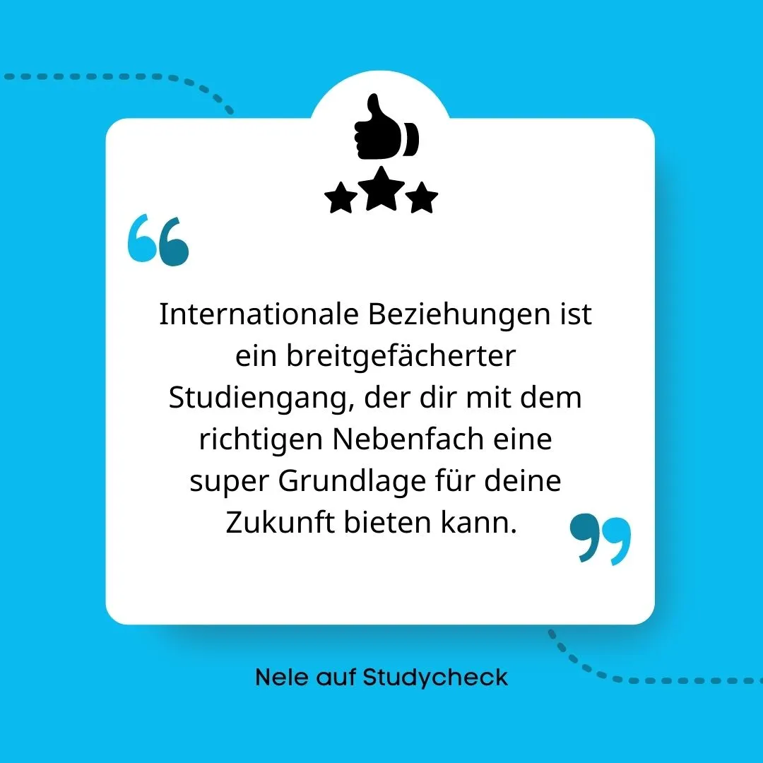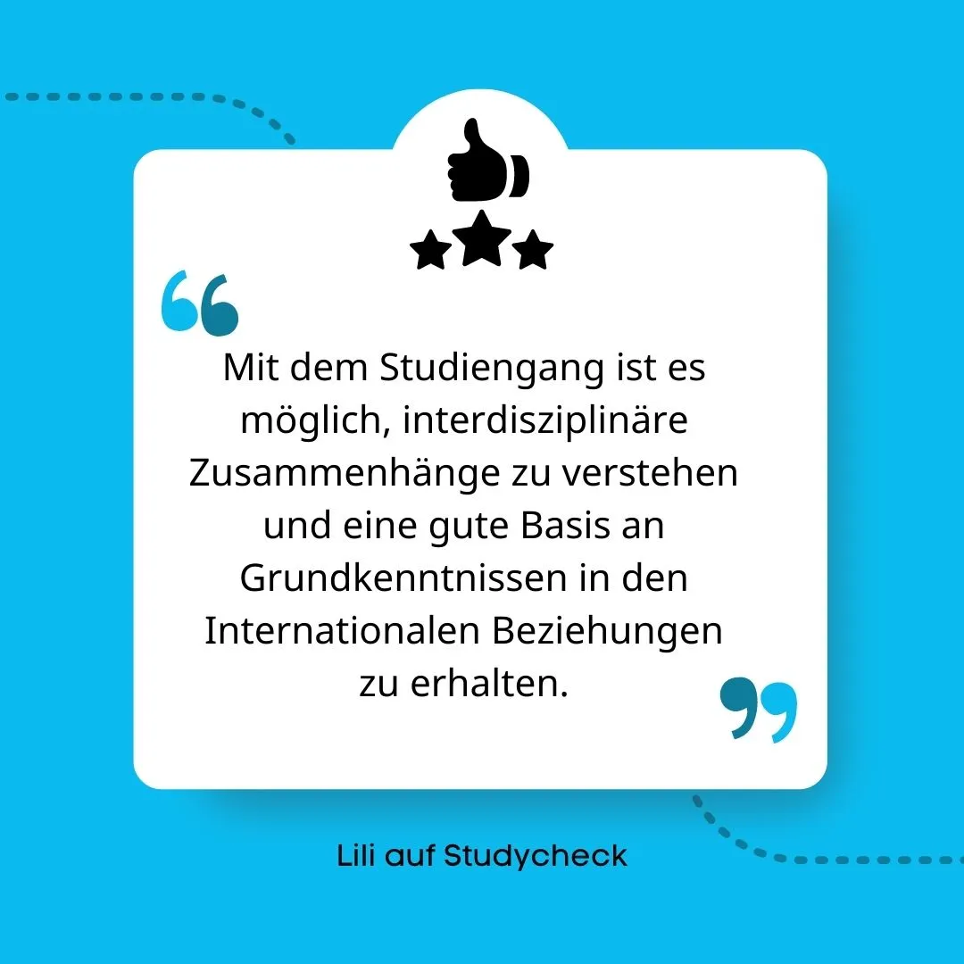 Viele Studierende beschreiben den Studiengang Internationale Beziehungen als “vielfältig” und “realitätsnah”. Sie finden, dass das Studium breit gefächert ist und die Themen aber dennoch ins Detail gehen. Die Studieninhalte sind direkt in den Alltag übertragbar, da die Module sowohl aktuelle politische, sozialwissenschaftliche oder rechtswissenschaftliche Themen aufgreifen und diese aufarbeiten. Unsere Studierenden empfehlen ihn aktuell zu 96 % weiter (laut Studycheck).