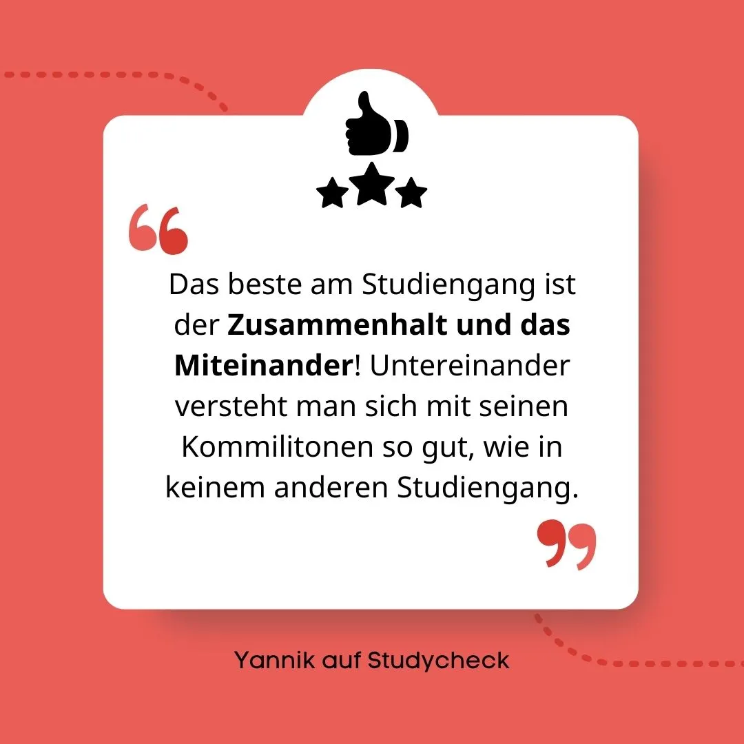 Hoher Zusammenhalt zwischen den Studierenden. Praxisrelevante Kurse werden von zum Großteil fairen und fachlich hoch qualifizierten Dozenten geleitet. Angenehmes Gleichgewicht zwischen theoretisch und praktisch bezogenen Kursen. Viele Wahlmöglichkeiten innerhalb der Module und zusätzliche Qualifikationen.