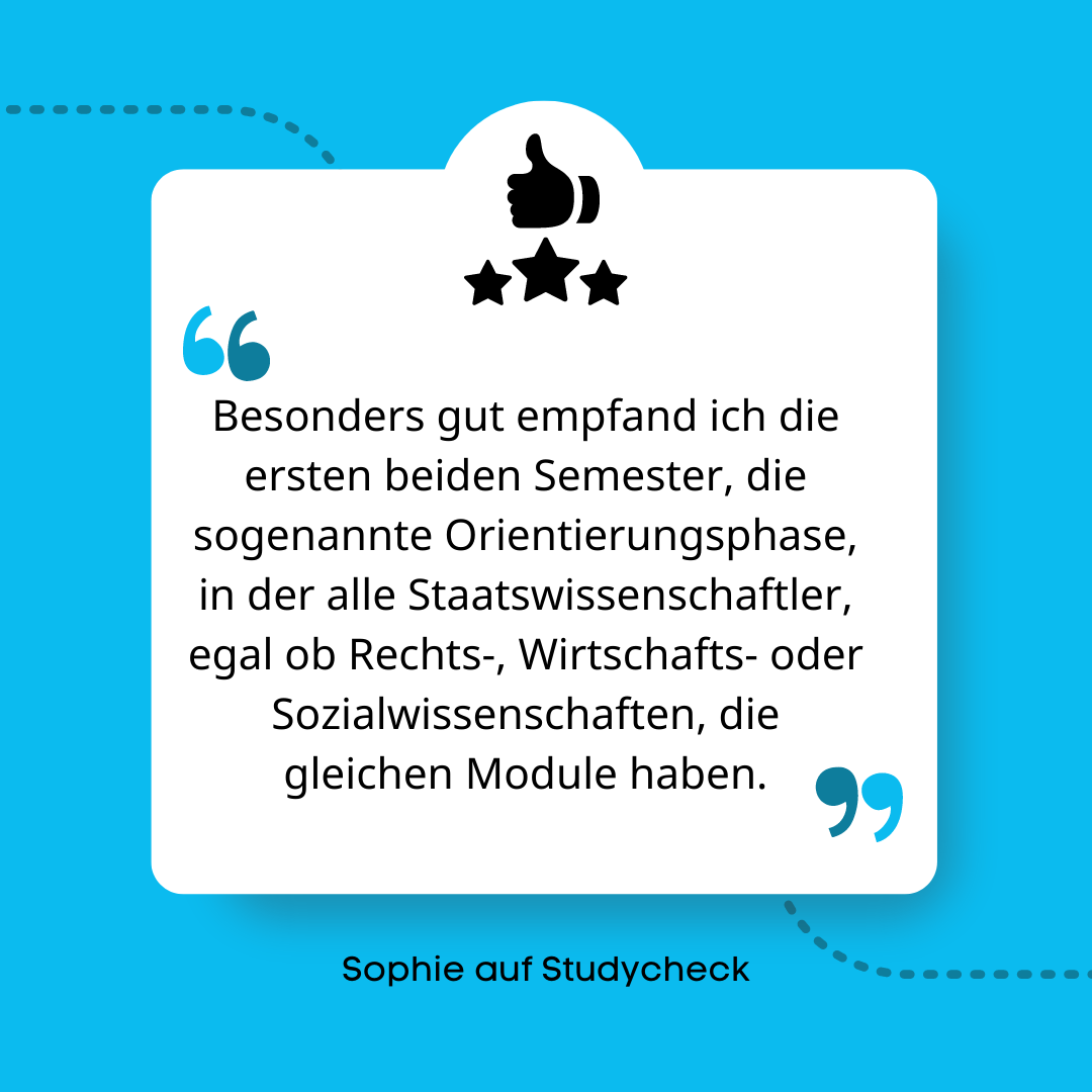 Ich habe Wirtschafts- und Sozialwissenschaften studiert und bin recht zufrieden damit. Besonders gut empfand ich die ersten beiden Semester, die sogenannte Orientierungsphase, in der alle Staatswissenschaftler, egal ob Rechts-, Wirtschafts-, Sozialwissenschaft oder internationale Beziehungen, die gleichen Module haben. So erkennt man schnell, ob einem besonders gut Recht, Wirtschaft, Sozialwissenschaft oder gar Politik liegen/nicht liegen. Man hat dann die Möglichkeit, bis zum Anfang des 3. Semesters die Studienfächer innerhalb der Staatswissenschaften zu wechseln, ohne dass man Stoff nachholen muss, was auf jeden Fall ein Plus ist.