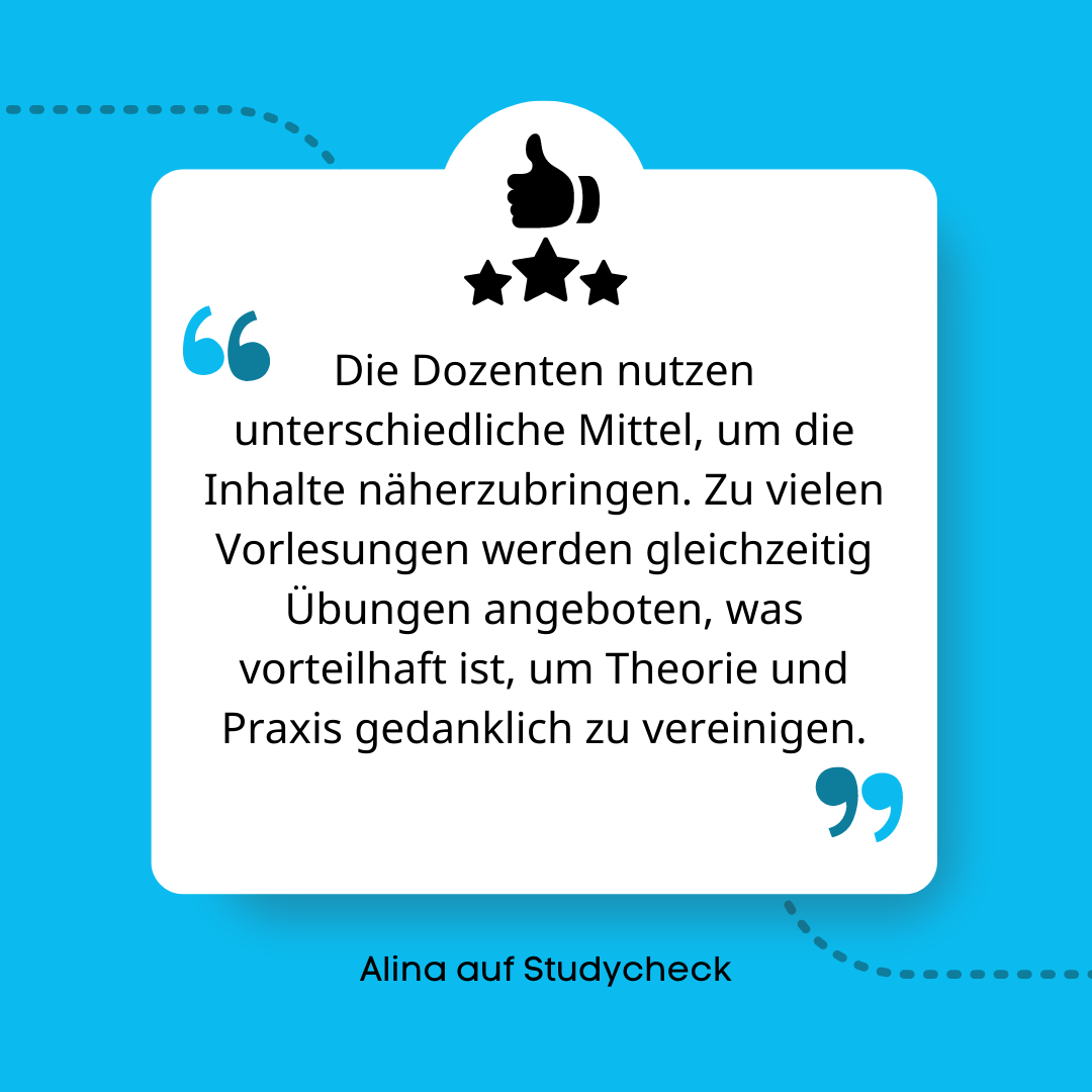 Das Studium ist sehr abwechslungsreich, es gibt ein großes Angebot an verschiedenen Seminaren und Modulen. Die Dozenten nutzen unterschiedliche Mittel, um die Inhalte nahezubringen. Zu vielen Vorlesungen werden gleichzeitig auch Übungen angeboten, was vorteilhaft ist, um Theorie und Praxis gedanklich zu vereinigen.