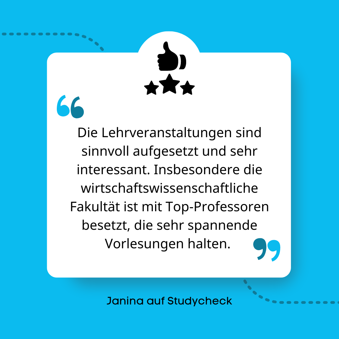 Das Studium an der Uni Erfurt hat meine Erwartungen voll und ganz erfüllt. Die Lehrveranstaltungen sind sehr interessant. Insbesondere die wirtschaftswissenschaftliche Fakultät ist mit Top-Professoren besetzt, die sehr spannende Vorlesungen halten. Die Orientierungsphase hat mir persönlich sehr viel gebracht. So habe ich mich nach den ersten Erfahrungen in dem Studienfeld dafür entschieden mein Hauptfach zu wechseln. Nicht nur die Uni, sondern auch die Stadt bieten viele Möglichkeiten das Studentenleben voll und ganz auszukosten. Highlights waren immer das Campus-Festival mit Live-Musik im Sommer, sowie die Ersti-Wochen zu Beginn des Wintersemesters (Partys, Kneipentouren etc.).
