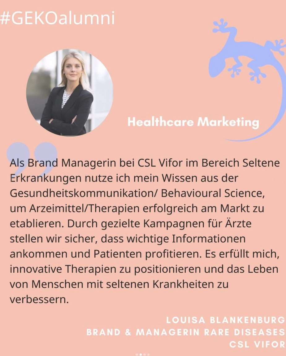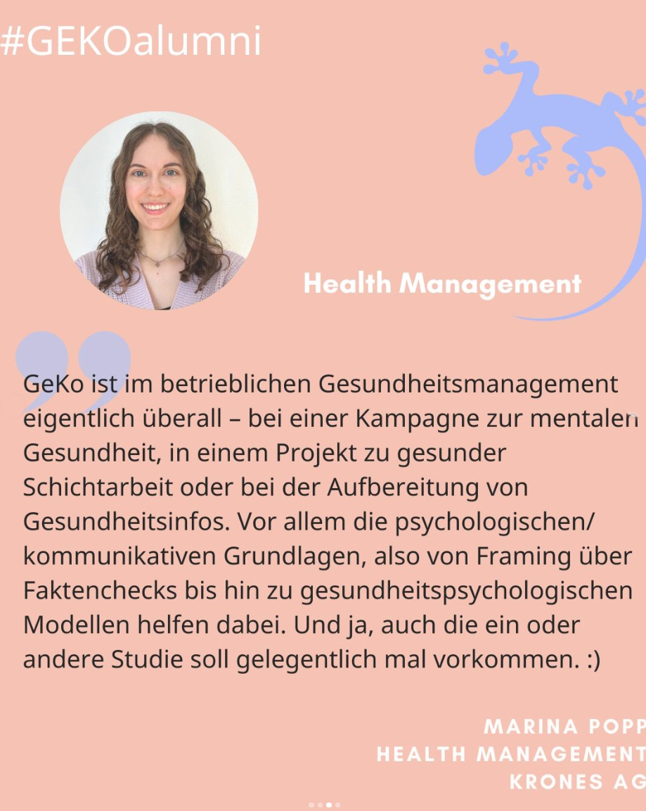 Ich kann den Master jedem empfehlen, der (z.B.) aus dem kommunikationswissenschaftlichen Bereich kommt und gerne nochmal was anderes machen möchte. Der Studiengang ist eine spannende Mischung aus Psychologie, Medizin und Public Health. Besonders die Psychologie-Vorlesung ist toll. Man sollte sich aber bewusst sein, dass es ein wissenschaftliches Studium ist und daher viel Wert auf Forschung und auch Statistik gelegt wird. Alles in allem motiviert mich immer, dass Gesundheit so ein wichtiges Thema ist, das Auswirkungen auf alle Lebensbereiche hat und man merkt den Studierenden an, dass sie etwas Positives bewirken wollen.