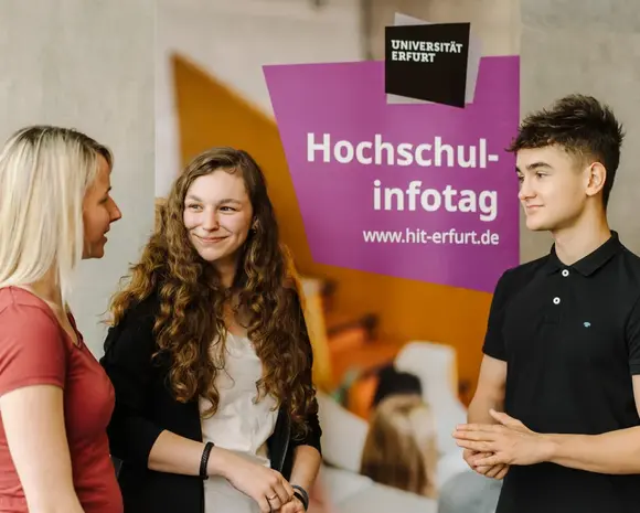 Zahlreiche Informations- und Beratungsangebote bieten Ihnen die Möglichkeit, sich beim Tag der offenen Tür persönlich von den Studien- und Lebensbedingungen in Erfurt zu überzeugen. Lernen Sie bei Führungen den grünen Campus und den schönen Altstadtkern kennen.