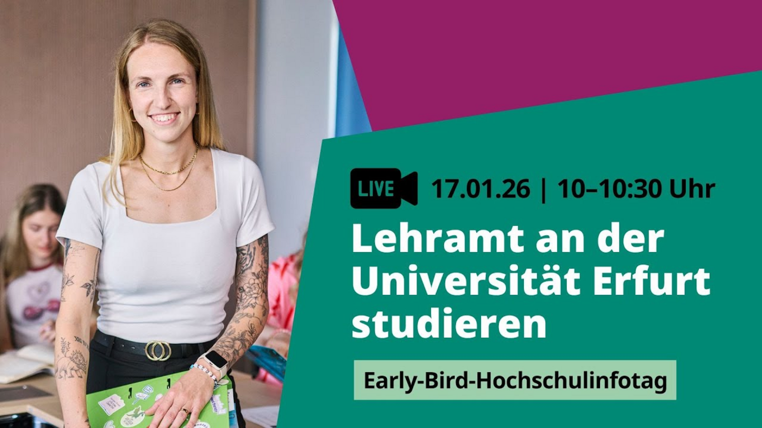 Du machst dieses Jahr dein Abitur und möchtest dich frühzeitig über ein Studium informieren und Studiengänge entdecken? Dann laden wir dich herzlich zum digitalen Early-Bird-Hochschulinfotag der Universität Erfurt ein. Du hast bequem von zu Hause aus die Gelegenheit, dich in kurzen Live-Sessions (Tool Webex) umfassend zu unseren Studienangeboten zu informieren und Antworten zu finden.