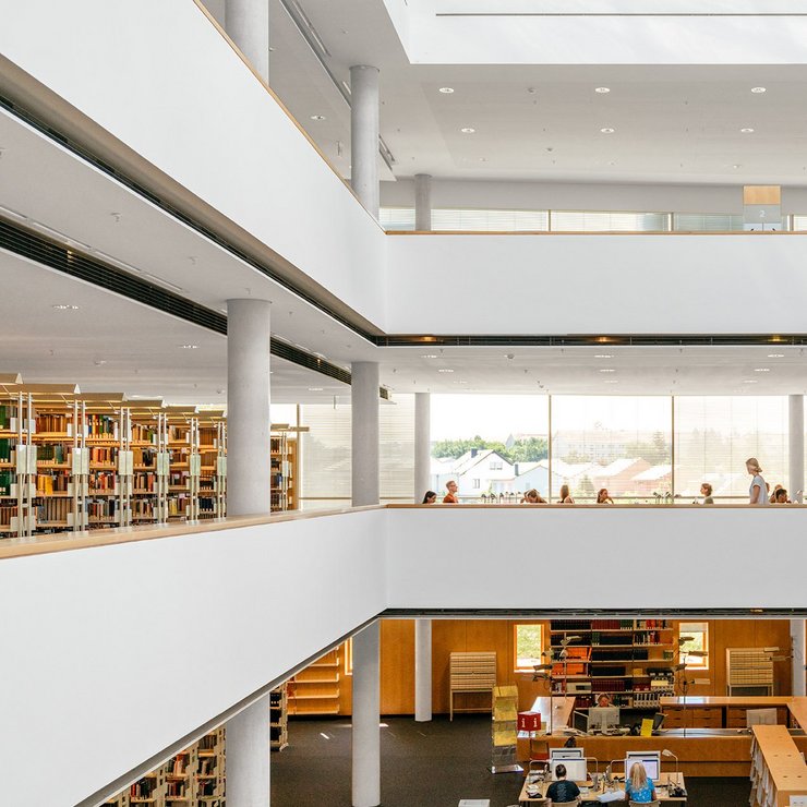 Die Universitätsbibliothek vereint Medien aller Fachgebiete unter einem Dach und bietet ausreichend Platz zum Lesen und konzentrierten Arbeiten.