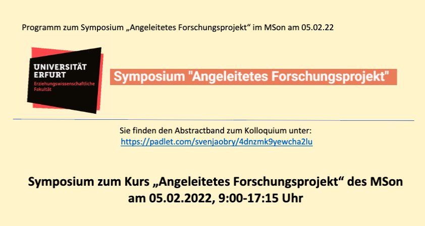 Am 05. Februar 2022 findet von 9-17:15 Uhr das Symposium des dritten Semsters des Masters Sonderpädagogik im Kurs "Angeleitetes Forschungsprojekt" statt. Das Symposium besteht aus sechs Blöcken, die jeweils in A und B untergliederte Angebote zur gleichen Zeit gehalten werden. Es können online per webex Beiträge zu den folgenden Themen gehört werden: