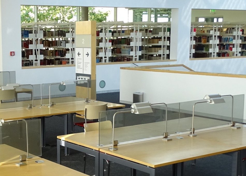 Aufgrund der aktuellen Abstandsregeln stehen in der Bibliothek nur Einzelarbeitsplätze in beschränkter Anzahl zur Verfügung. Für die Nutzung dieser Plätze ist ab Montag, dem 30.11.2020 eine elektronische Reservierung erforderlich. Ein Arbeitsplatz kann für maximal 4 Stunden im Voraus reserviert werden, Verlängerungen sind erlaubt. Es stehen Arbeitsplätze mit und ohne Terminal bzw. PC auf allen Etagen zur Verfügung.
