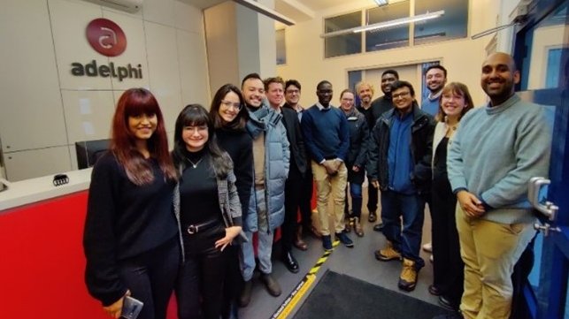 Meeting adelphi in their premises. From let to right: Soumita Chakraborty, Liz Lopez, Laisa Pereira, Mikael Ferreira, Andreas Goldthau, Alejandro Mendiondo, Ebrima Jarju, Daria Ivleva, Dennis Tänzler, Emmanuel Aduku, Anadha Vijaya Kumar, Tassilo Scalera, Pia Schrage and Noor Alam.