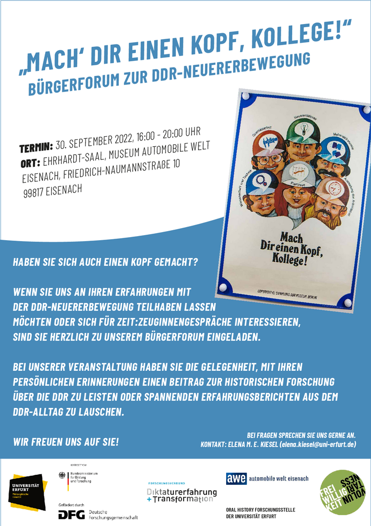 Das Bürgerforum wird am 30. September 2022 stattfinden. die Veranstaltung ist eine Kooperation zwischen der Forschungsgruppe Freiwilligkeit und der Professur für Neuere und Zeitgeschichte und Geschichtsdidaktik, die zusammen mit der Oral History Forschungsstelle der Universität Erfurt und dem Forschungsverbund "Diktatur und Transformation" auch im Feld der Zeitzeug:innenforschung arbeiten.