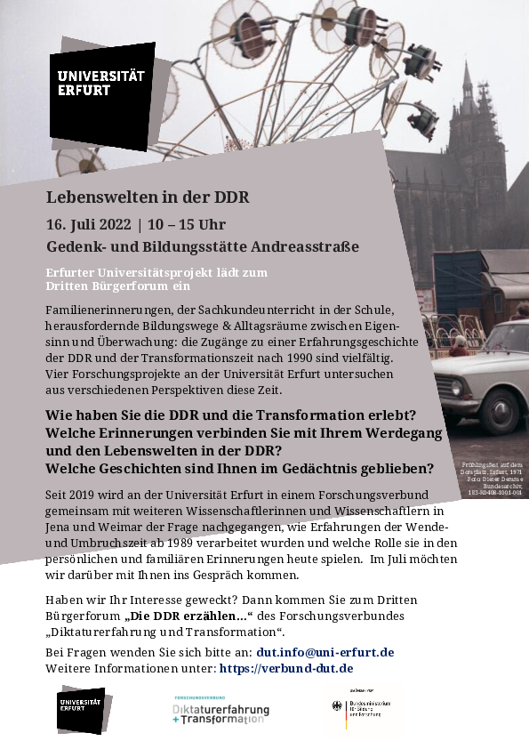 Am 16. Juli veranstalten die Erfurter Teilprojekte ein drittes Bürgerforum unter dem Motto "Die DDR erzählen" von 10.00 - 15.00 Uhr in der Gedenk- und Bildungsstätte Andreasstraße.