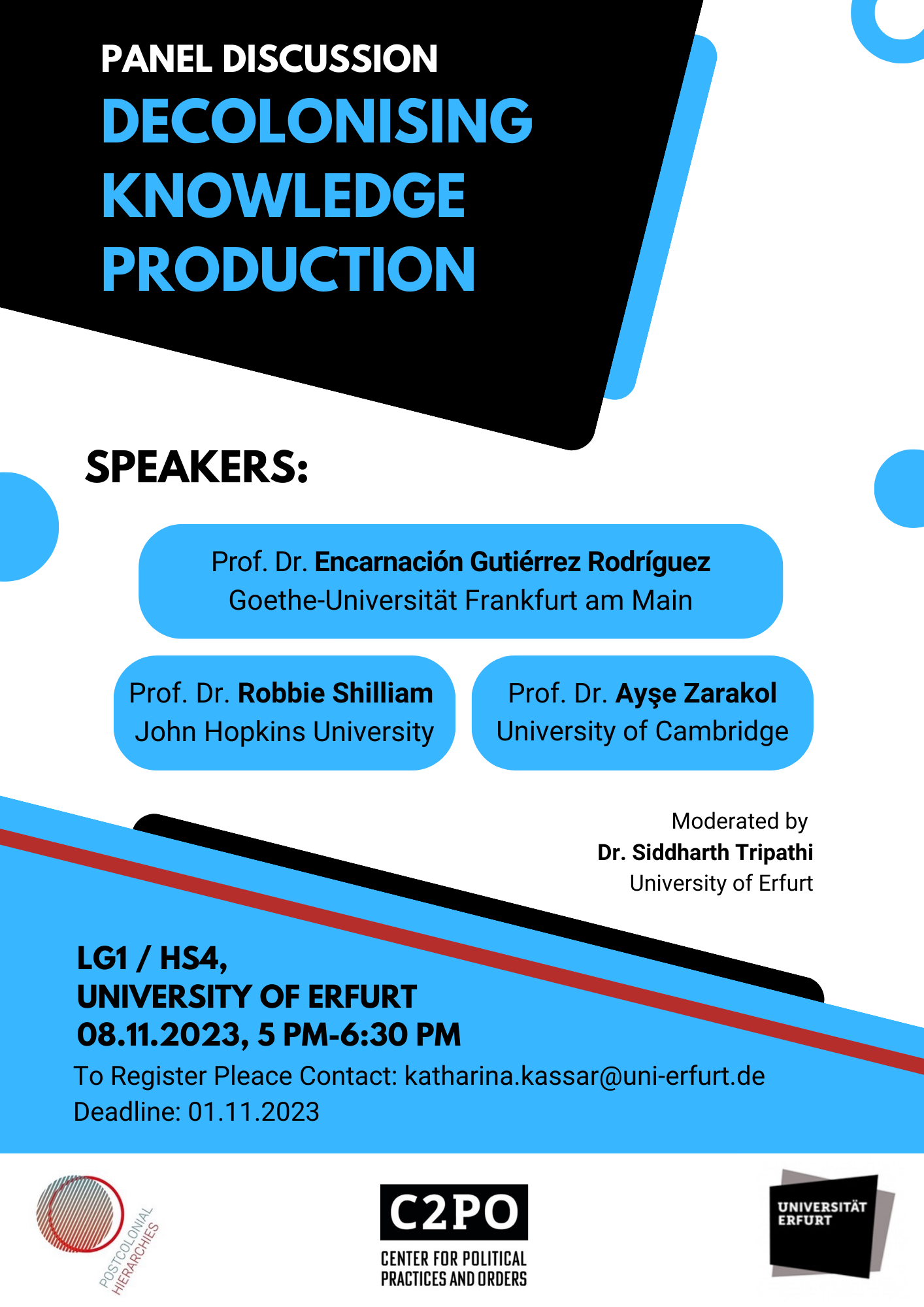 Podiumsdiskussion mit Prof. Dr. Encarnación Gutiérrez Rodríguez (Goethe-Universität, Frankfurt am Main), Prof. Dr. Robbie Shilliam (John Hopkins University) und Prof. Dr. Ayse Zarakol (University of Cambridge). Moderation: Dr. Siddharth Tripathi (Universität Erfurt).