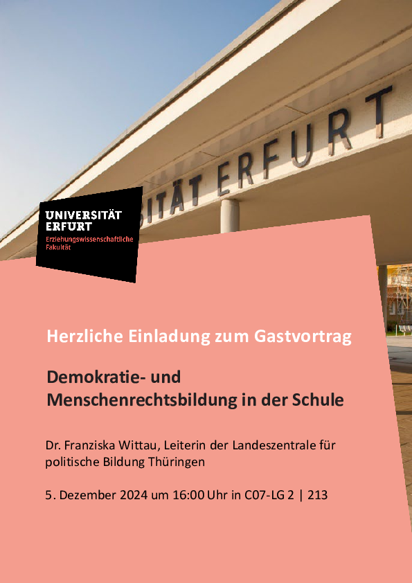 Wir möchten Sie herzlich zum Gastvortrag “Demokratie- und Menschenrechtsbildung in der Schule” mit Dr. Franziska Wittau (Leiterin der Landeszentrale für politische Bildung Thüringen) am 05. Dezember 2024 um 16:00 Uhr im C07 (LG2) / Raum 213 einladen. Eine vorherige Anmeldung ist nicht notwendig.