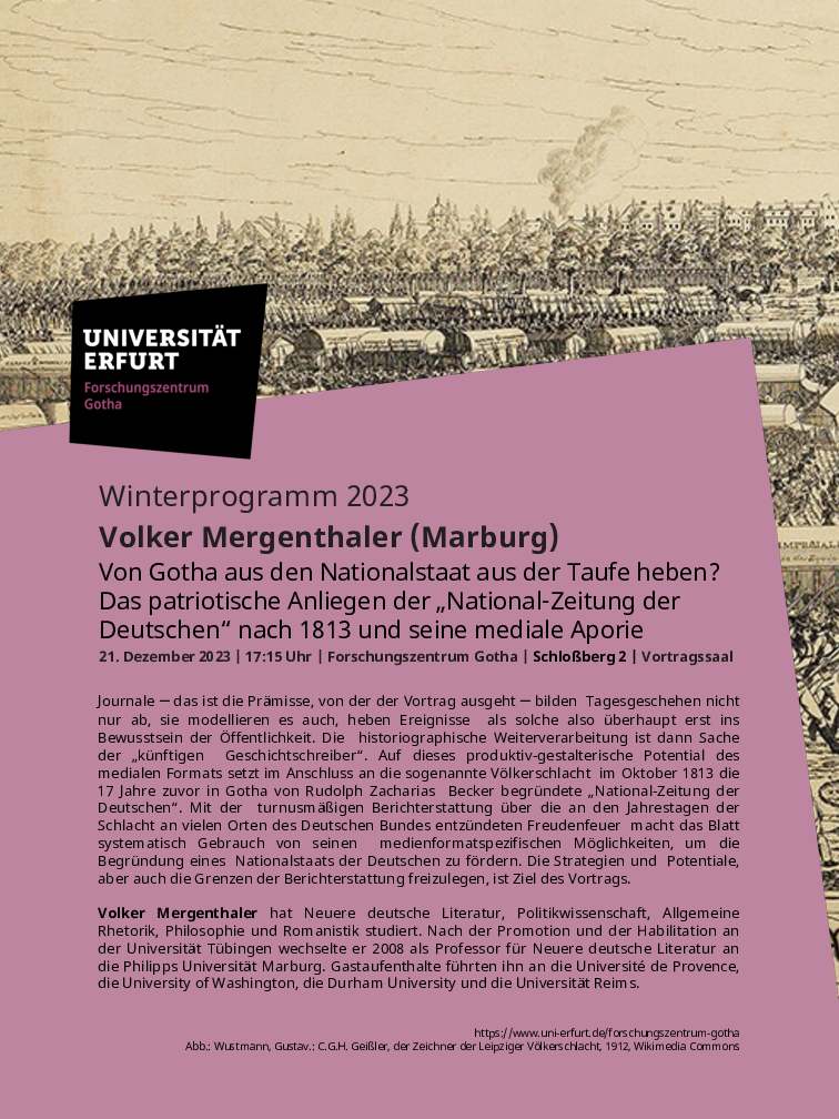 Journale – das ist die Prämisse, von der der Vortrag ausgeht – bilden Tagesgeschehen nicht nur ab, sie modellieren es auch, heben Ereignisse als solche also überhaupt erst ins Bewusstsein der Öffentlichkeit. Die historiographische Weiterverarbeitung ist dann Sache der „künftigen Geschichtschreiber“. Auf dieses produktiv-gestalterische Potential des medialen Formats setzt im Anschluss an die sogenannte Völkerschlacht im Oktober 1813 die 17 Jahre zuvor in Gotha von Rudolph Zacharias Becker begründete „National-Zeitung der Deutschen“. Mit der turnusmäßigen Berichterstattung über die an den Jahrestagen der Schlacht an vielen Orten des Deutschen Bundes entzündeten Freudenfeuer macht das Medium systematisch Gebrauch von seinen formatspezifischen Möglichkeiten, um die Begründung eines Nationalstaats der Deutschen zu fördern. Die Strategien und Potentiale, aber auch die Grenzen der Berichterstattung freizulegen, ist Ziel des Vortrags mit dem Titel "Von Gotha aus den Nationalstaat aus der Taufe heben? Das patriotische Anliegen der National-Zeitung der Deutschen nach 1813 und seine mediale Aporie".