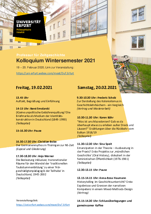 Am 19. und 20. 2021 findet das Doktorandenkolloquium der Professur Kuller statt. Zur Anmeldung und für die im Vorfeld verschickten Texte kontaktieren Sie bitte florian.wagner@uni-erfurt.de. Den Teilnahmelink finden Sie auf dem Plakat.