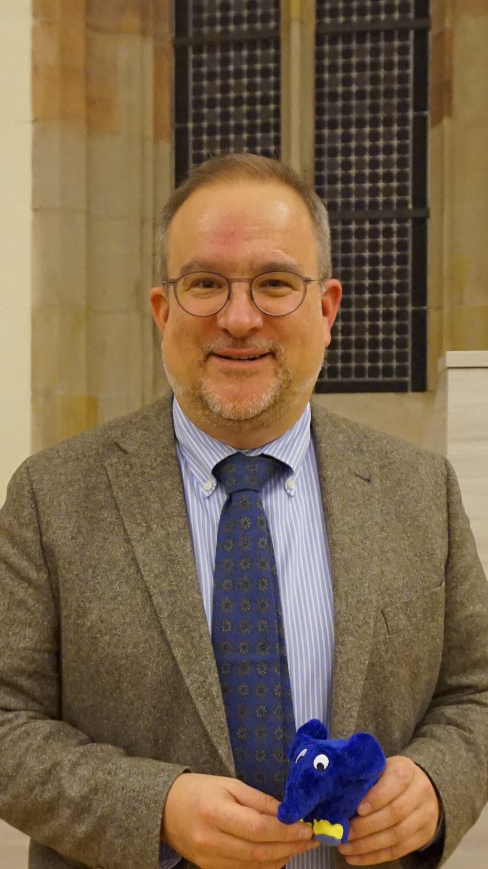 Um Erfahrungen eines gelungenen Miteinanders ging es auch im Grußwort von Franziska Weber, die als Vertreterin der Studierendenschaft anwesend war. Sie hob besonder die Freundlichkeit und Geduld von Prof. Zaborowski im Umgang mit den Studierenden hervor und sorgte für einiges Schmunzeln im Saal, als sie erzählt, dass der Philosophieprofessor, um komplizierte Sachverhalte zu erklären, gerne auf einen roten Elefanten zurückgreift. Zu Ehren dieses beispielhaften Elefanten überreichte sie als Geschenk der Studierendenschaft eine Plüschverson des Elefanten aus der Sendung mit der Maus.