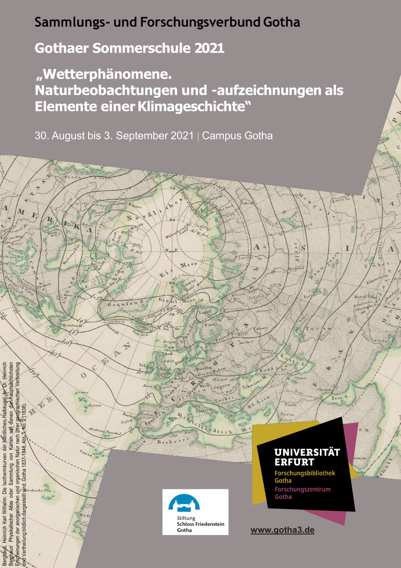 Als Teil des Themenschwerpunkts 2020/21 „Klima in historischer Perspektive“ bietet die Gothaer Sommerschule 2021 einem interdisziplinären Teilnehmerkreis die Gelegenheit, die Gothaer Sammlungen aus diesem besonderen Blickwinkel kennenzulernen. Die Veranstaltung präsentiert das einzigartige Ensemble der Gothaer Sammlungen und erlaubt einen tieferen Einblick in einzelne Bestandsgruppen.