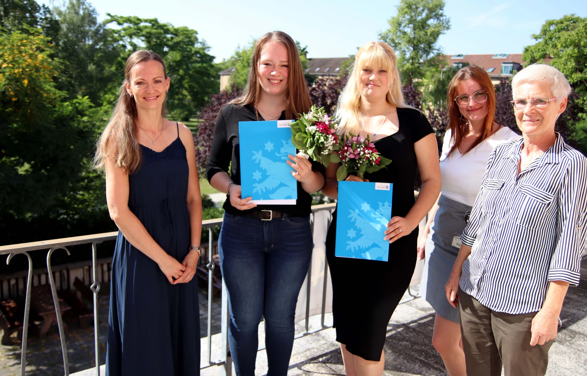 Susan Brand, Christin Hoffmann, Dr. Valentina Tischer und Andreas Schöppl als Ausbilder*innen und Nadine Pippus-Wehlisch, die Leiterin des Dezernats Personal, zeigten sich stolz auf die Absolvent*innen. Deren Erfolg beweise erneut, dass die Universität Erfurt nicht nur ein guter Platz zum Studieren, sondern auch eine hervorragende Ausbildungseinrichtung ist. Pippus-Wehlisch: „Auszubildende sind immer auch ein Gewinn für die Universität. Sie bringen frischen Wind und neue Perspektiven ein und animieren uns, Bestehendes immer wieder zu hinterfragen. Sie können stolz auf sich sein, aber wir sind natürlich auch stolz auf sie.“