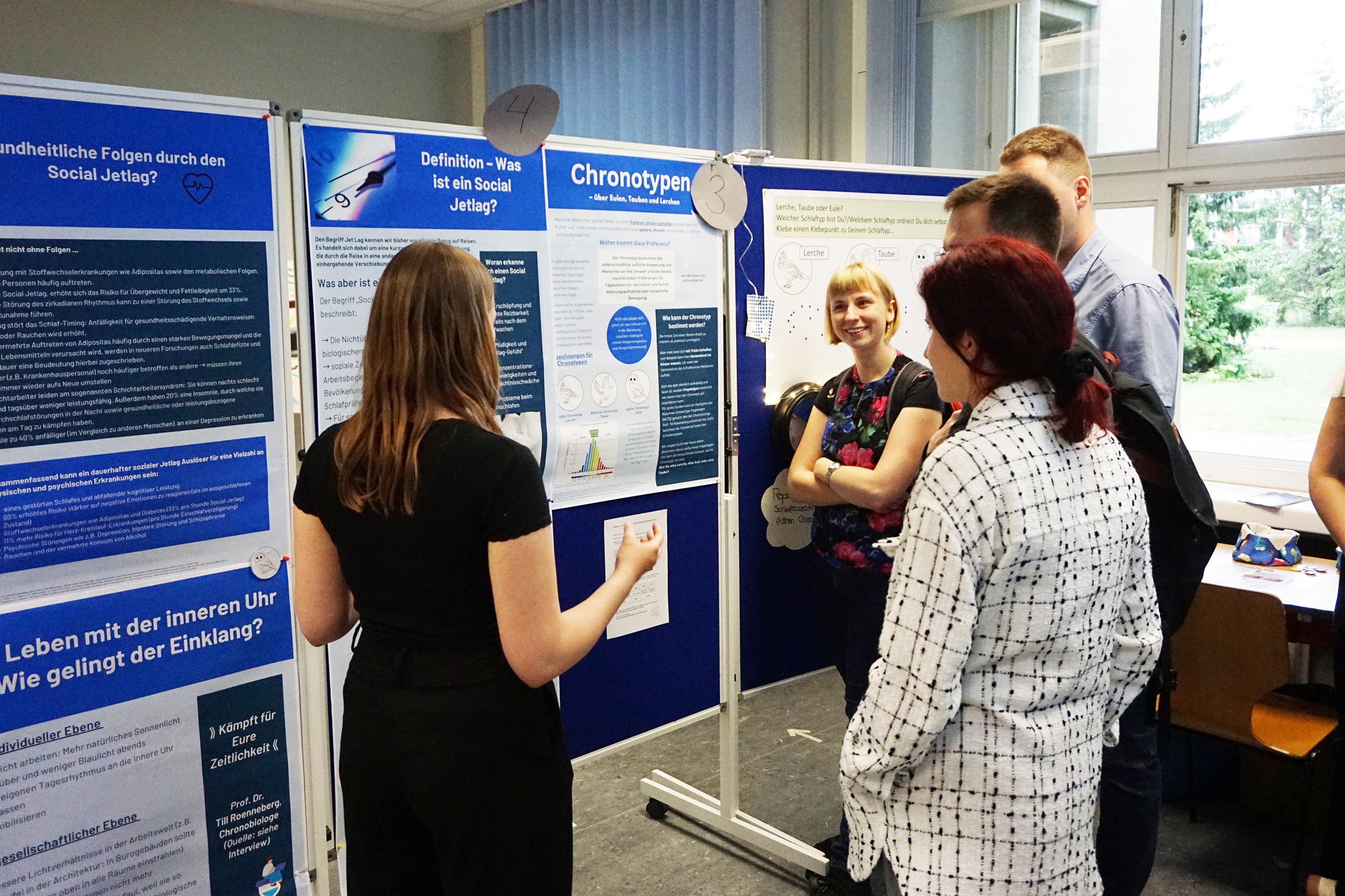 Lerche, Taube oder Eule? Die Ausstellung zum Thema Schlaf bot Expertenwissen von Deutschlands bekanntesten Schlafforscher und Chronobiologen Till Roenneberg. Die Student*innen erklärten Besucher*innen die unterschiedlichen Chronotypen und warum 'Social Jetlag' gesundheitliche Folgen hat.