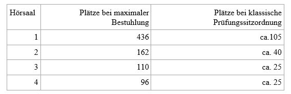 Wenn die elektronischen Prüfungen unter Aufsicht auf dem Campus durchgeführt werden, beschränkt die Art der Sitzordnung die maximale Anzahl an Prüflingen, die gleichzeitig in einem Raum schreiben können. In der Tabelle finden Sie für die vier Hörsäle, die über Steckdosen in den Sitzreihen verfügen, eine Kalkulation der nutzbaren Prüfungsplätze, wenn die klassische Sitzordnung mit einem freien Platz und einer freien Reihe zwischen den Prüflingen zugrunde gelegt wird.