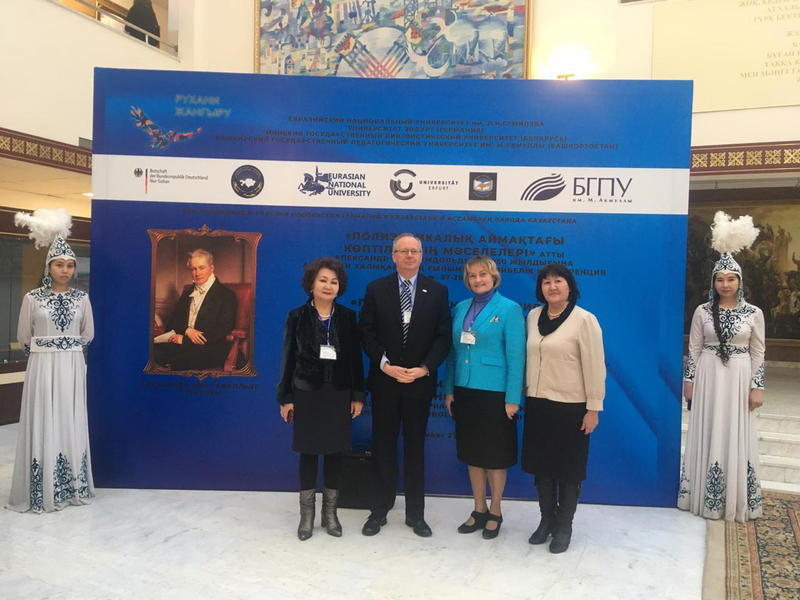 Der Fachbereich Germanistische Sprachwissenschaft der Universität Erfurt war – zusammen mit der Eurasischen Nationalen L. N. Gumilev-Universität Nur-Sultan (Kasachstan), der Linguistischen Universität Minsk (Weißrussland) und der Baschkirischen Staatlichen Pädagogischen Universität Ufa (Russische Föderation: Baschkortostan) – Mitveranstalter einer internationalen Tagung zum Thema „Probleme der Mehrsprachigkeit in multiethnischen Räumen“, die am 27. und 28. November 2019 in Nur-Sultan (Kasachstan) stattfand. Die Veranstaltung widmete sich dem 250. Geburtstag von Alexander von Humboldt; als Arbeitssprachen fungierten Kasachisch, Russisch, Englisch, Deutsch und Französisch. Neben dem klassischen Vortragsprogramm mit Plenarsitzungen, Sektionsreferaten und Rundtischgesprächen wurde auch eine Resolution zur Förderung der gesellschaftlichen und institutionellen Mehrsprachigkeit verabschiedet. Folgende Bilder sollen einen Einblick in die Atmosphäre der Tagung bieten.