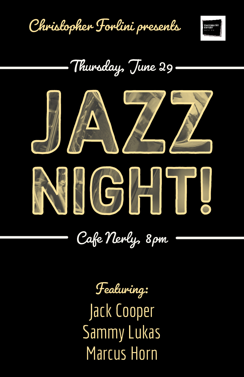 Das Sprachenzentrum präsentiert dank Organisation von Christopher Forlini einen weiteren legendären Jazz-Abend am 29. Juni 2023 mit Jack Cooper, Sammy Lukas und Marcus Horn.