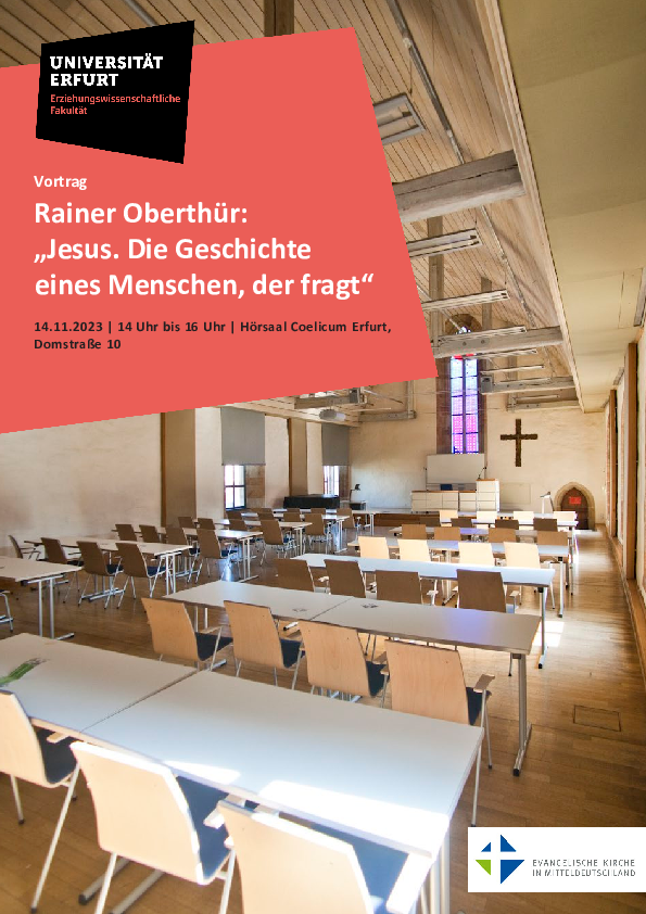 Am 14.11.23 hält Herr Rainer Oberthür einen Gastvortrag mit den Titel "Jesus. Die Geschichte eines Menschen, der fragt" im Rahmen einer Seminarreihe zu theologischen Gesprächen im Unterricht. Wir laden Sie herzlich ein, die Veranstaltung im Hörsaal "Coelicum" (Domstraße 10, Erfurt) in der Zeit von 14:00 Uhr bis 16:00 Uhr zu besuchen.