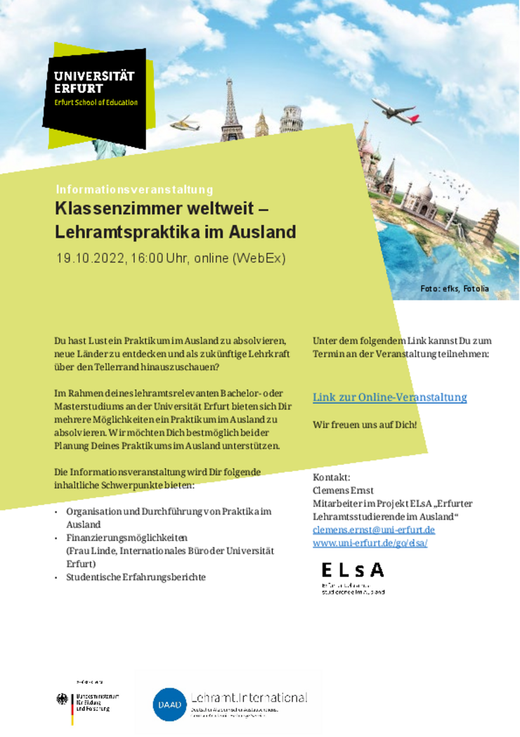 Informationsveranstaltung zum Lehramtspraktikum im Ausland. Die Veranstaltung findet online via Webex statt.