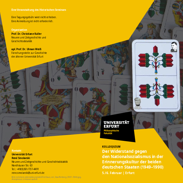 Am 5. und 6. Februar 2020 findet im Festsaal des Rathauses Erfurt und in der kleinen Synagoge das Kolloquium "Der Widerstand gegen den Nationalsozialismus in der Erinnerungskultur der beiden deutschen Staaten (1949–1990)" statt. Das Kolloquium wird von der Professsur für Zeitgeschichte mit organisiert.