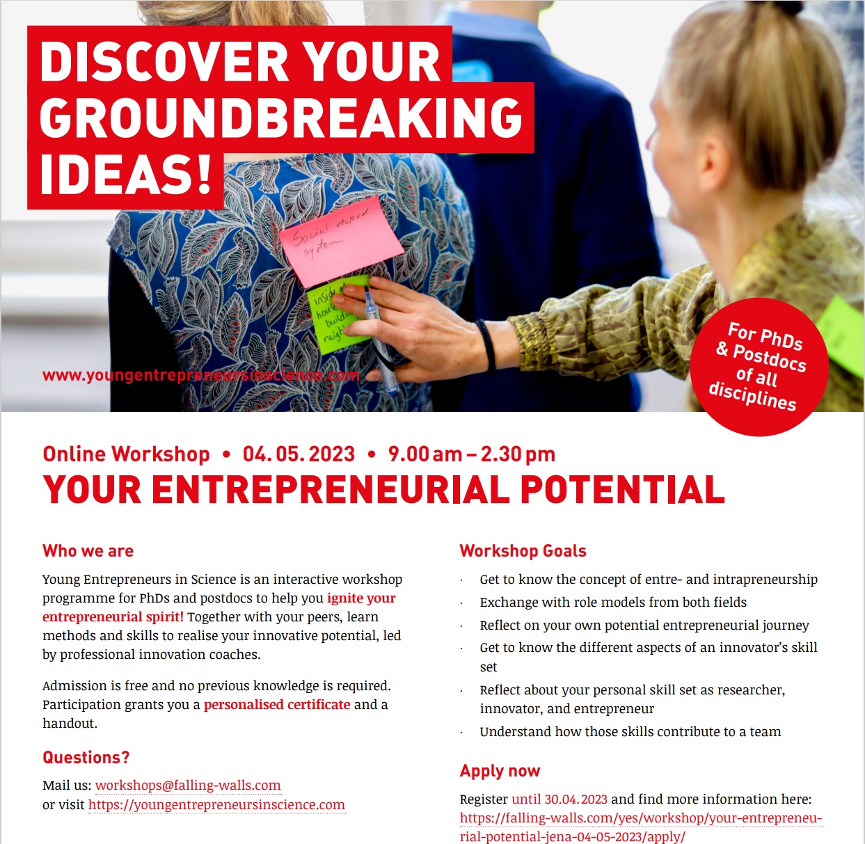 Register here: https://falling-walls.com/yes/workshop/your-entrepreneurial-potential-jena-04-05-2023/apply/