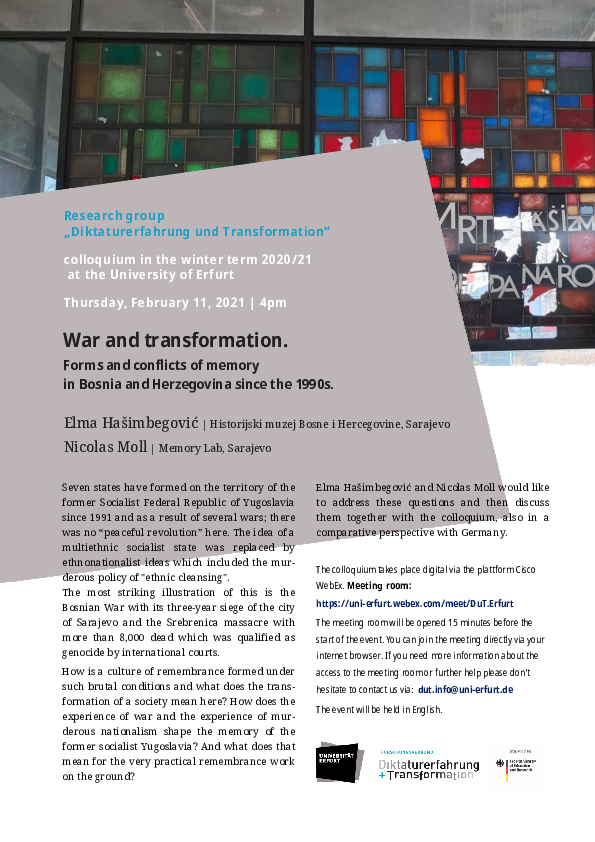 Vortrag im Kolloquium Diktatur und Transformation von Elma Hašimbegović, Historijski muzej Bosne i Hercegovine, Sarajevo Nicolas Moll, Memory Lab, Sarajevo