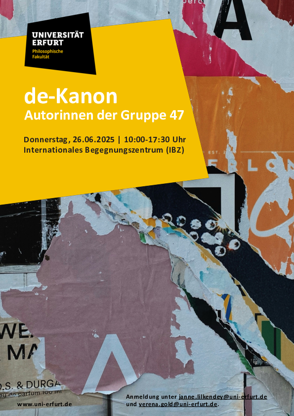 Wir, Verena Gold und Janne Lilkendey, möchten alle Interessierten herzlich einladen zu unserem Lektüre-Workshop de-Kanon. Autorinnen der Gruppe 47 am Donnerstag, den 26.06.25. Die Veranstaltung findet von 10.00-17.30 Uhr im IBZ statt, um eine Anmeldung via Email wird für die genauere Planung gebeten.