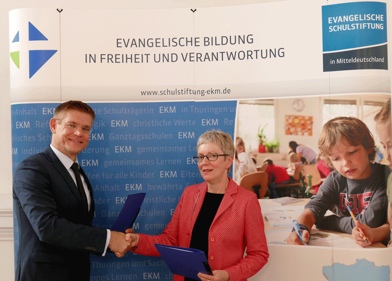 Die Studierenden der Uni Erfurt sollen künftig Praktikumsplätze in der Stiftung und ihren Schulen zur Verfügung gestellt bekommen. Zudem soll ihnen die Teilnahme an Weiterbildungsangeboten der Schulstiftung ermöglicht werden. Darüber hinaus unterstützt die Stiftung die (Lehr-)Veranstaltungen des Martin-Luther-Instituts sowie Forschungsvorhaben zum Evangelischen Schulwesen. „Außerdem wird die Evangelische Schulstiftung Förderer für ein von der Universität Erfurt zu vergebendes Deutschlandstipendium“, freut sich Prof. Schulte. Im Gegenzug macht das Martin-Luther-Institut Lehrkräften an Evangelischen Schulen Fortbildungsangebote und initiiert Forschungsvorhaben und Publikationen über das Evangelische Schulwesen. Ebenfalls in Planung: die Organisation einer regelmäßigen Vortrags- und Diskussionsveranstaltung zu einem für Lehrkräfte an Evangelischen Schulen bedeutsamen Thema.
