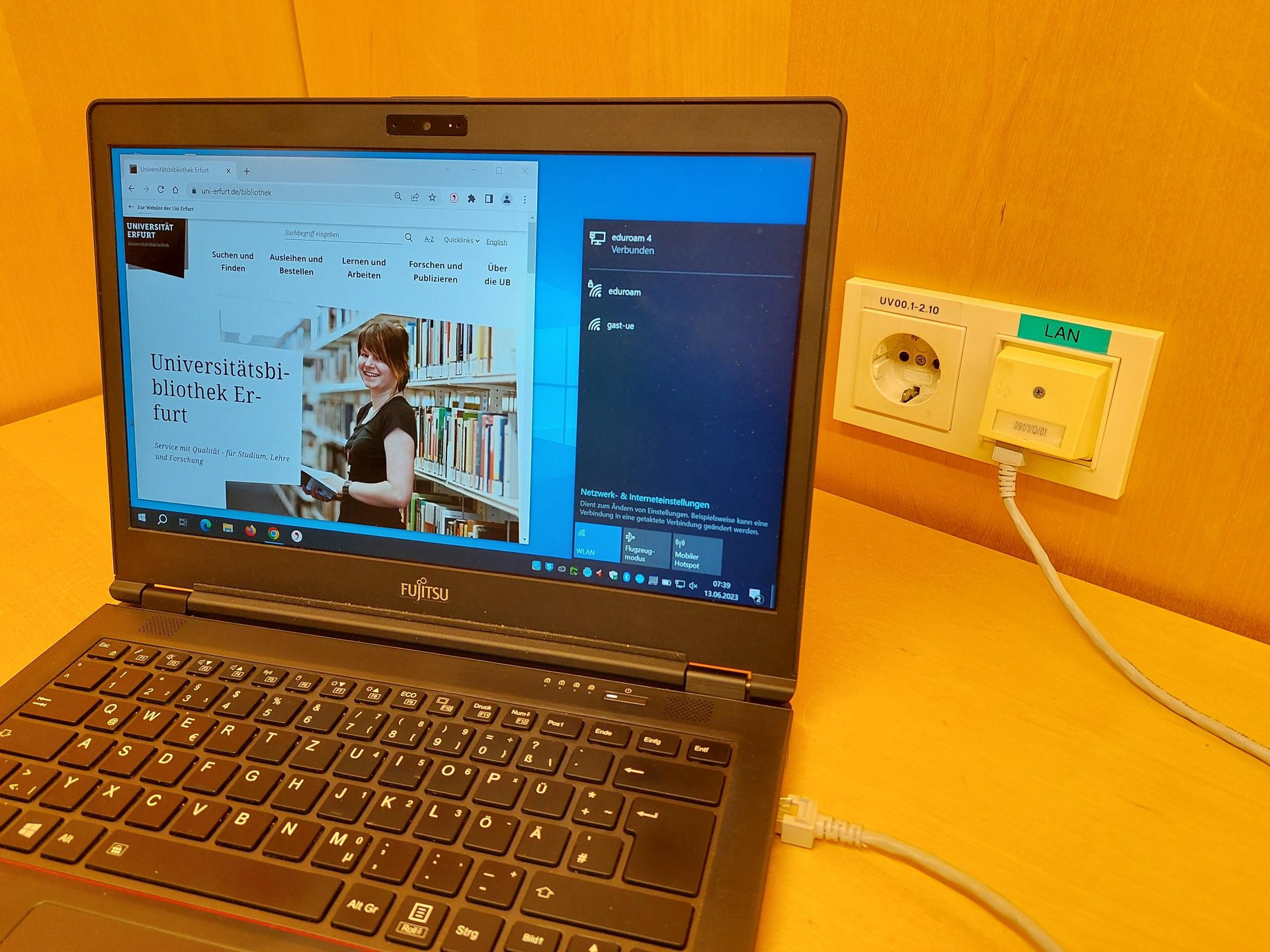 In der Universitätsbibliothek gibt es ab sofort die Möglichkeit, mit einem mitgebrachten LAN-Kabel und einem persönlichen Notebook das Internet zu nutzen.