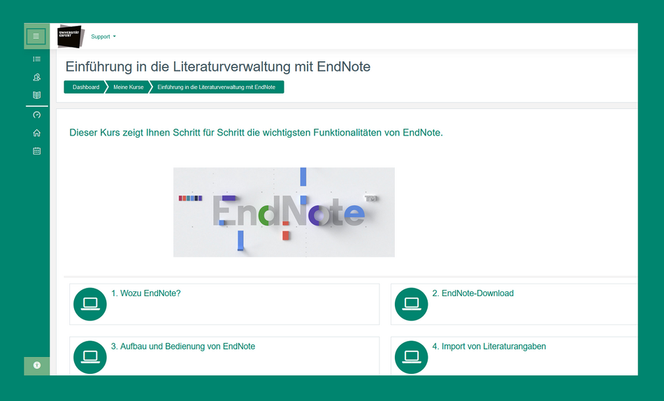 Gerne können Sie den Kurs in eigene Moodle-Kurse zu universitären Lehrveranstaltungen integrieren. Bei Interesse an einer EndNote-Schulung innerhalb Ihrer (Online-) Seminare oder dem Wunsch nach einer Einzelberatung, schreiben Sie uns eine E-Mail an benutzerschulung.ub@uni-erfurt.de.