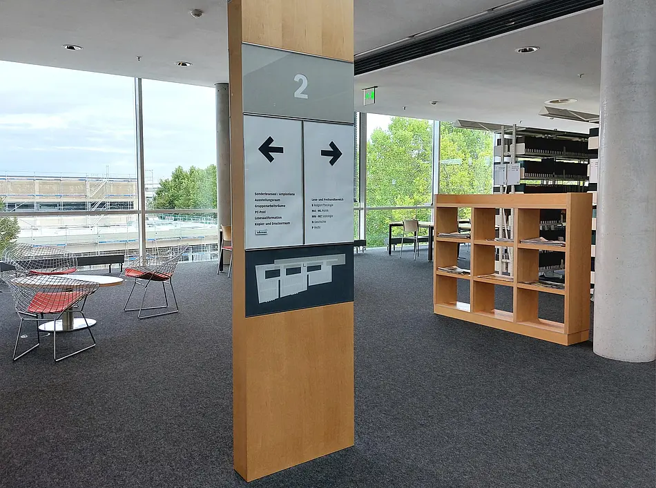 Es befindet sich nun im 2. OG der Bibliothek im Bereich Religionswissenschaften (B). Ein großer Tisch zum bequemen Ausbreiten der Zeitungen sowie einige Sessel laden zum Lesen ein.
