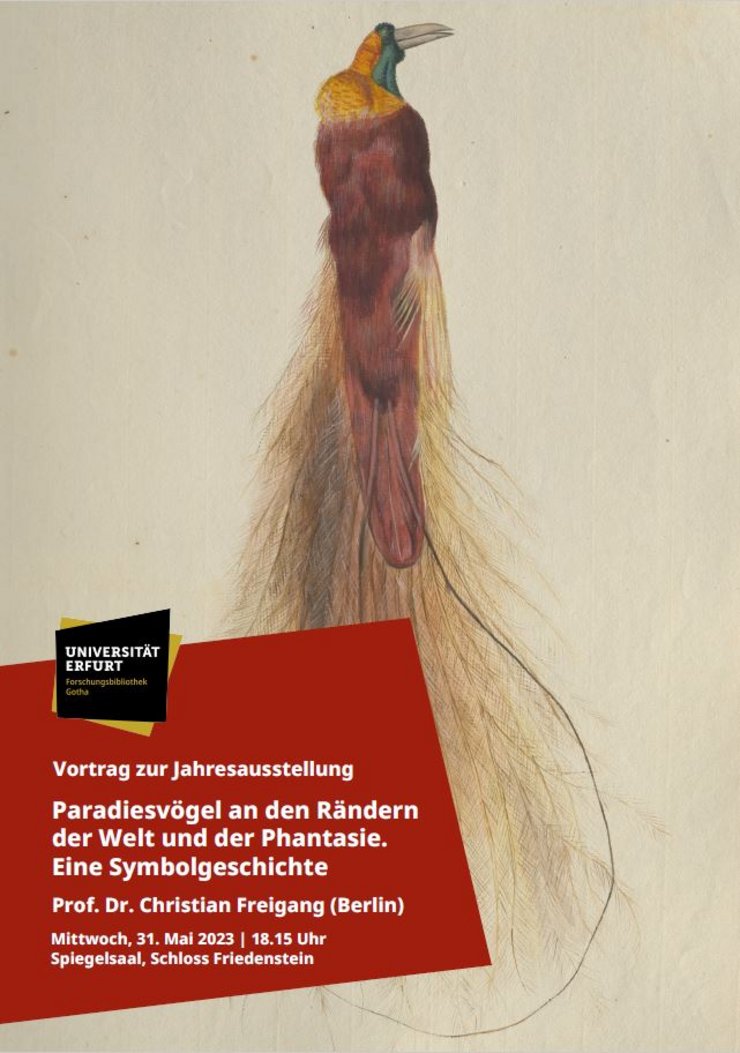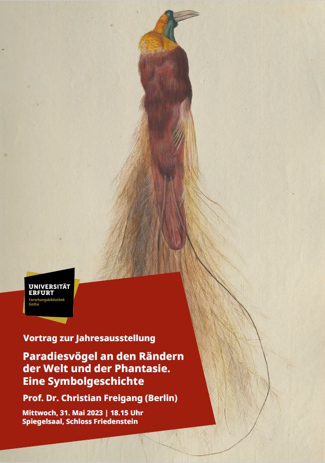 Von heute aus betrachtet, ist es kurios, dass diese mythischen Vorstellungen der Vögel des Paradieses dann durch die Überseefahrten um 1500 vollauf bestätigt wurden: reine Federn in fantastischer Farbenpracht, und so vermengten sich lange die Ideen von den wunderbaren und exotischen Rändern der Welt mit der ornithologischen Beschreibungen sowie der künstlerischen Ausgestaltung und der Präsentation der schönen Vögel. Bestätigt wurde dies durch die zur ähnlichen Zeit entdeckten farbenprächtigen Vögel und den bunten Federschmuck am anderen Rand der Welt, nämlich in Mittel- und Südamerika. Der Vortrag des Berliner Kunst- und Architekturhistorikers Prof. Christian Freigang wird diese Überlagerungen von mythischen Assoziationen und ornithologischer Neugier an der Wende zur Renaissance verfolgen und Bilder dieser Anverwandlungen besprechen.