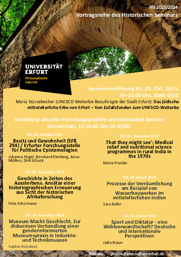 Im Laufe der Vortragsreihe des Historischen Seminars im Wintersemester 2023/24 werden sich aktuelle Erfurter Forschungsprojekte vorstellen. Herzliche Einladung zum Vortrag aus den Projekten der Professur für Wissenschaftsgeschichte am Donnerstag, den 26. Oktober, 12-14 Uhr im LG4/D01!
