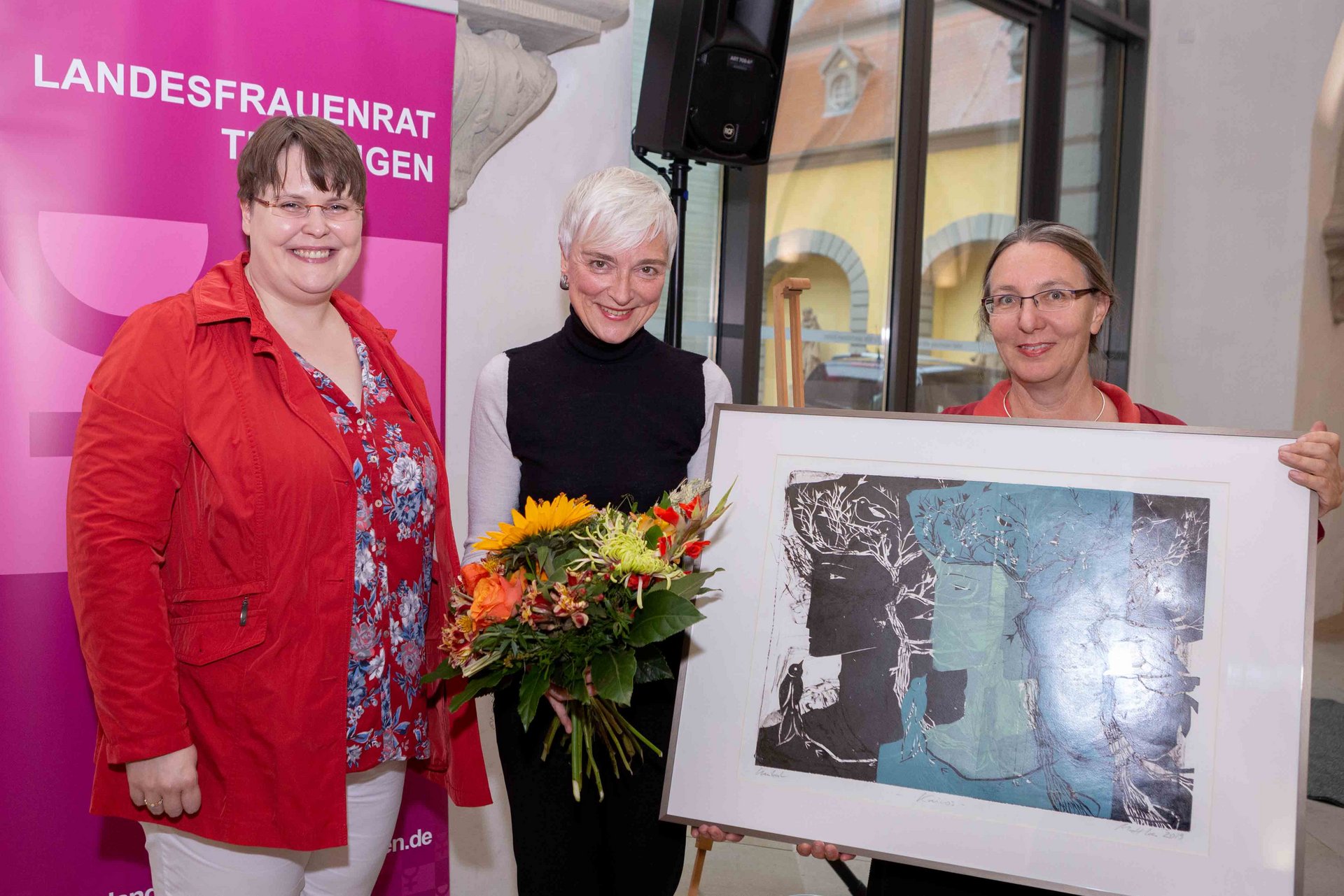 Der Landesfrauenrat vergibt keinen Geldpreis, sondern einen Kunstpreis. Thüringer Künstler*innen können sich für die Gestaltung bewerben und erhalten somit eine Plattform, ihre Kunst zu präsentieren. In diesem Jahr gestaltete die Erfurter Künstlerin Monika Matthes das Bild „Kairos“.