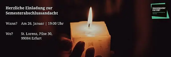 Der Mittelbau der Katholisch-Theologischen Fakultät lädt am Montag, den 26. Januar um 19:00 Uhr herzlich zu einer Andacht zum Semesterabschluss nach St. Lorenz ein.