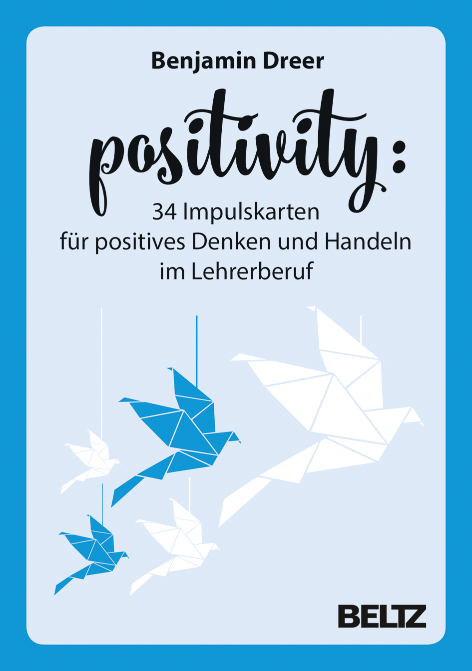Dr. Benjamin Dreer von der Universität Erfurt hat vor diesem Hintergrund gemeinsam mit dem BELTZ-Verlag ein Kartenset mit 34 Impulsen zur Förderung von Positivity (engl. positive Einstellung) im Lehrerberuf entwickelt, das in diesen Tagen erscheint. Ziel ist es, die vielen existierenden Ratgeberbücher zum Umgang Stress im Lehrerberuf um einen wissenschaftlich fundierten und zugleich in seiner Handhabung und Einsetzbarkeit innovativen Ansatz zu ergänzen. Anstelle von „gutem Rat“ gibt das Set Handlungsimpulse, die Lehrerinnen und Lehrer einladen, für sich selbst, aber auch im Sinne ihrer unmittelbaren beruflichen Umwelt positiv aktiv zu werden.