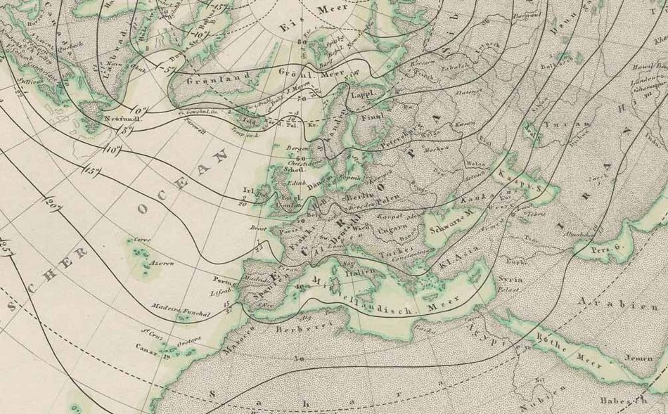 Bildnachweis: Berghaus, Heinrich Karl Wilhelm: Die Isothermkurven der Nördlichen Halbkugel, in: Dr. Heinrich Berghaus' Physikalischer Atlas oder Sammlung von Karten auf denen die hauptsächlichsten Erscheinungen der anorganischen und organischen Natur nach ihrer geographischen Verbreitung und Vertheilung bildlich dargestellt sind, Gotha 1837-1848, Abt. 1, No. 2 (1838).