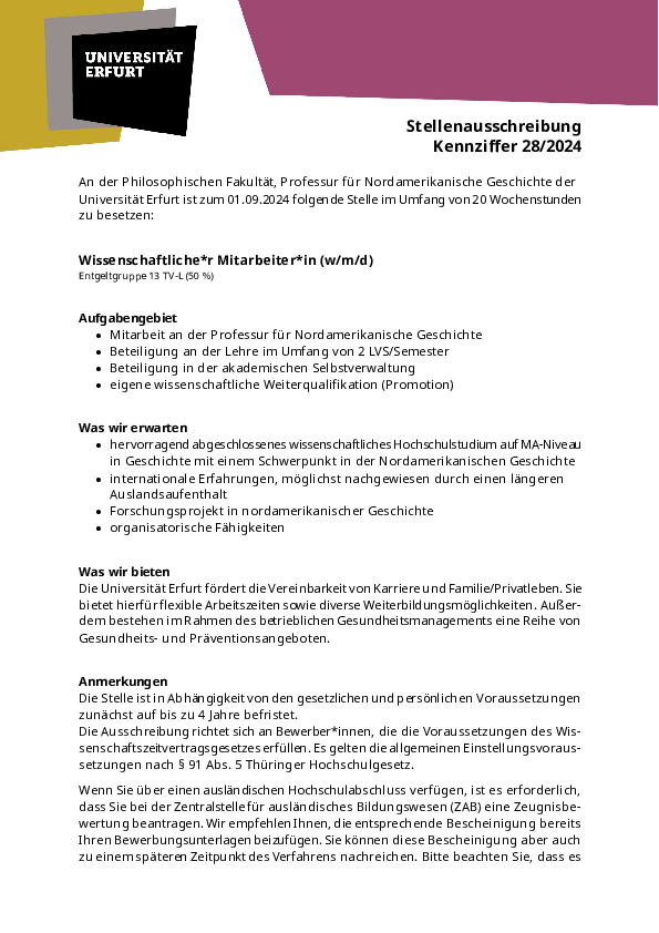 Ihre Bewerbung mit aussagekräftigen Unterlagen (Anschreiben, Lebenslauf, Zeugniskopien, Darstellung des Promotionsvorhabens, ggf. Verzeichnis der Veröffentlichungen und universitären Lehrveranstaltungen) senden Sie bitte ausschließlich online bis zum 30.05.2024 über das Bewerbungsmanagementsystem der Universität Erfurt.